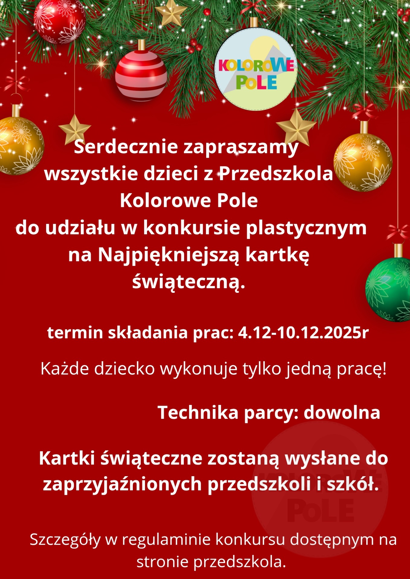 IV Uczestnictwo w konkursie: W konkursie może wziąć udział dziecko uczęszczające do Przedszkola Kolorowe Pole w Dachowie, Zadaniem konkursowym jest przygotowanie przez dziecko kartki świątecznej dowolną techniką, w formacie nie większym niż A5, kartka bez życzeń, Jeden uczestnik może wykonać tylko jedną pracę, a do dekoracji należy wykorzystać zewnętrzną część kartki, Do każdej pracy powinna być dołączona ( nieprzyklejona) metryczka z informacją o jej autorze ( imię i nazwisko , wiek, nazwa grupy), Rozstrzygnięcie konkursu nastąpi 12.12.2025r.