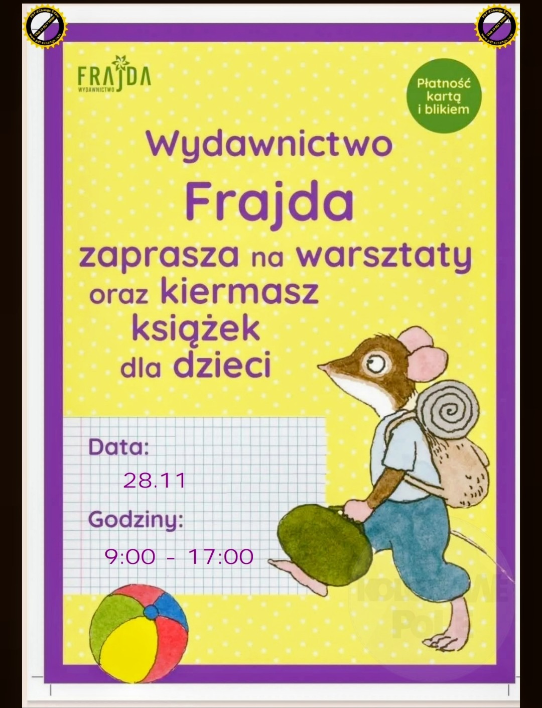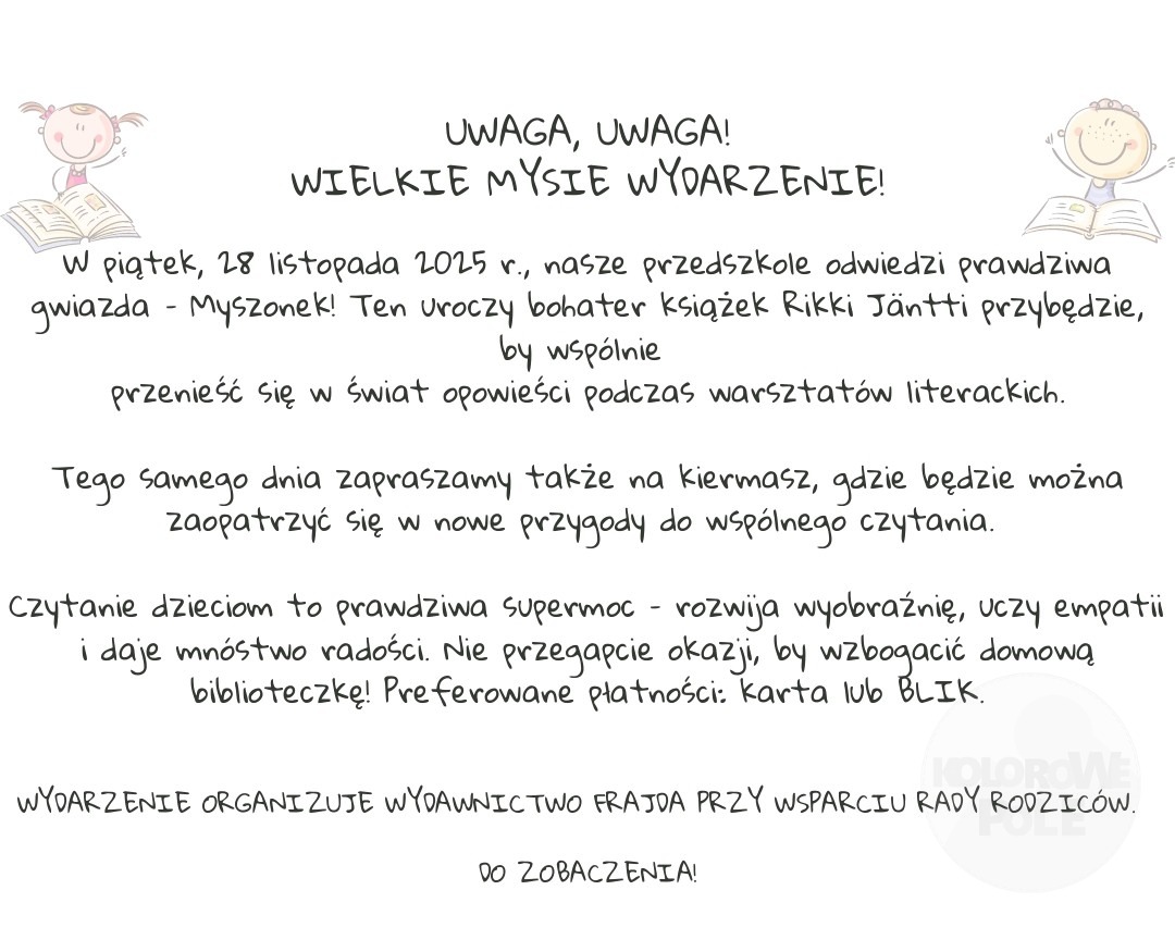 Wraz z Wydawnictwem Frajda po raz kolejny zapraszamy wszystkie przedszkolaki na warsztaty i kiermasz książki.
